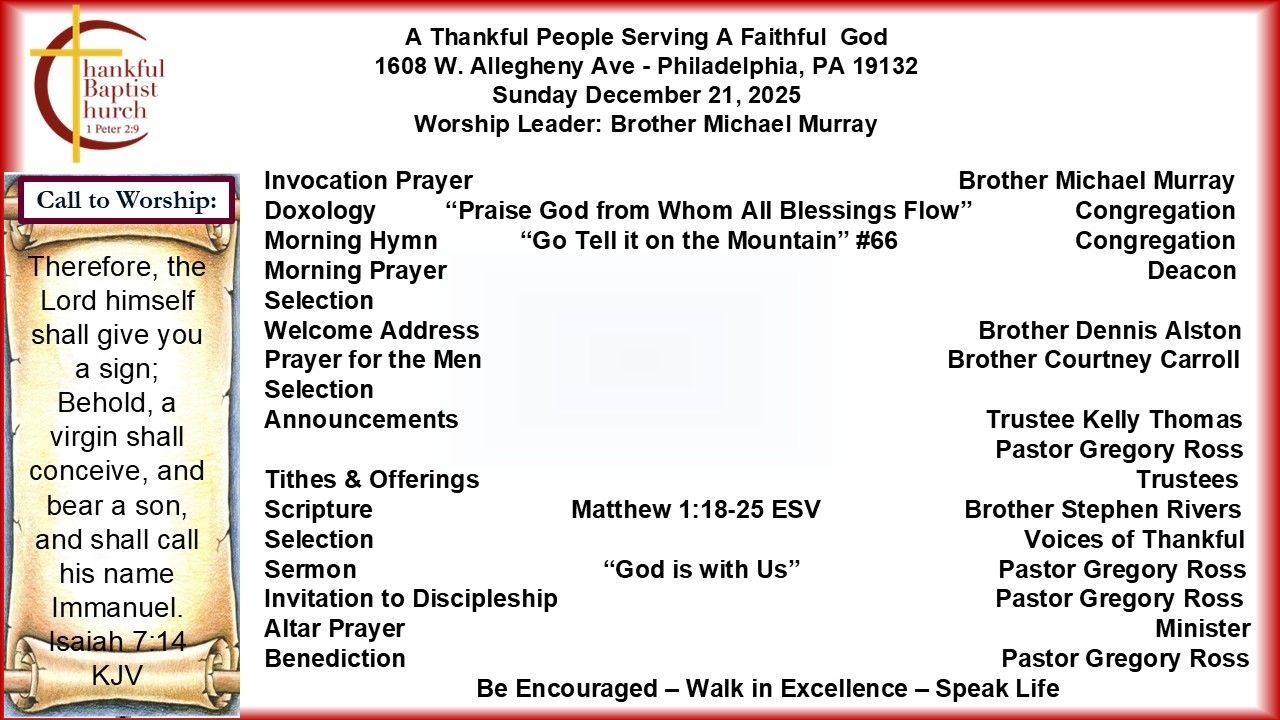 The Pastor is available on Wednesdays from 10 am-4 pm. Please call us at 215-229-5024 (option #2) to set an appointment.